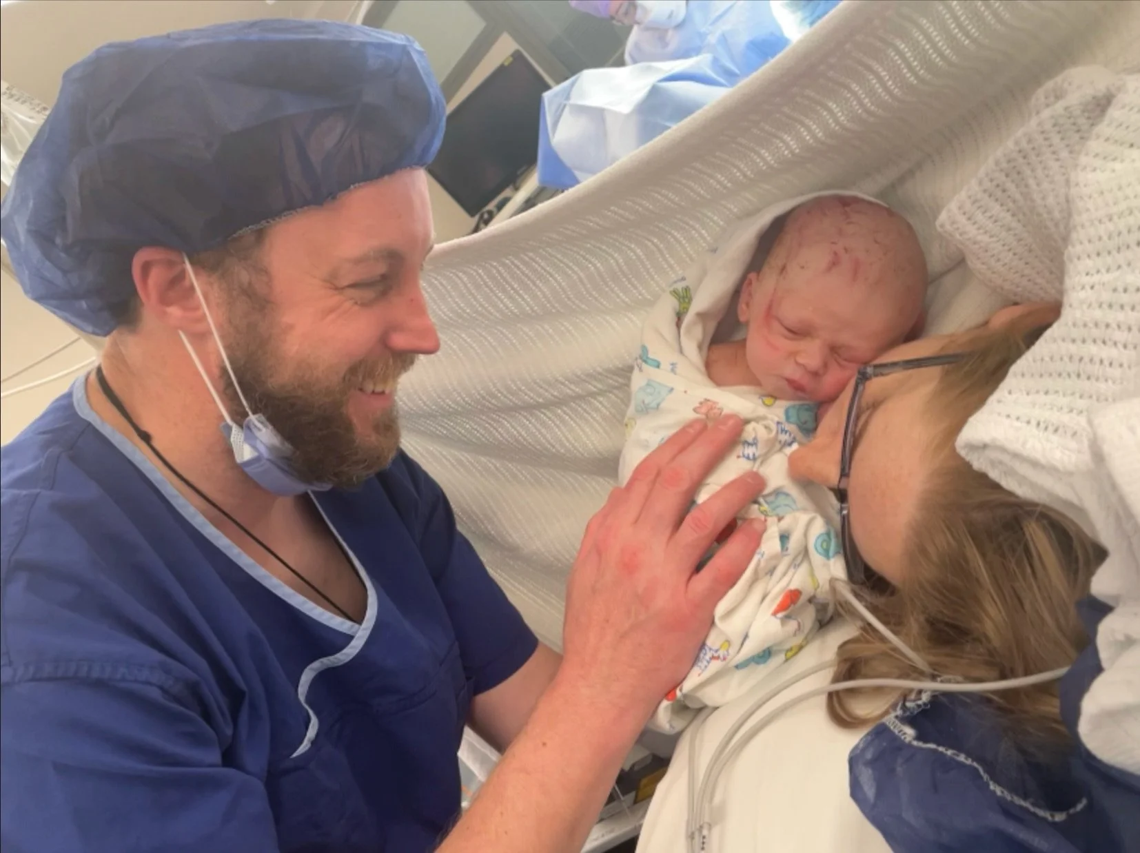 “Our birth plan was respected and the lights were off. We had LED candles, music and the monitoring noises were kept low. It’s a bit of a blur for my husband and I but after what felt like a short time pushing, our baby boy was stuck and I was unable to push him out.”